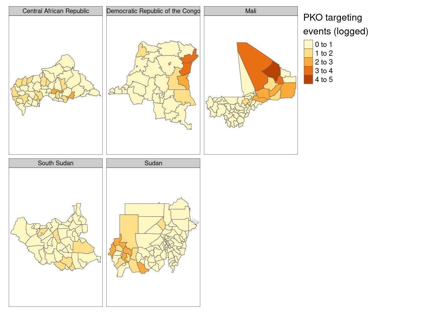 I’m working with cleaned and subsetted versions of ACLED and GADM, which I’ve uploaded to my website as PKO.Rdata if you want to download them and run this code yourself. The acled object contains a list of attacks on peacekeepers in active Chapter VII UN peacekeeping missions in Subsaharan Africa, while the adm object contains all of the second order administrative districts (ADM2) in the five countries with active missions.
