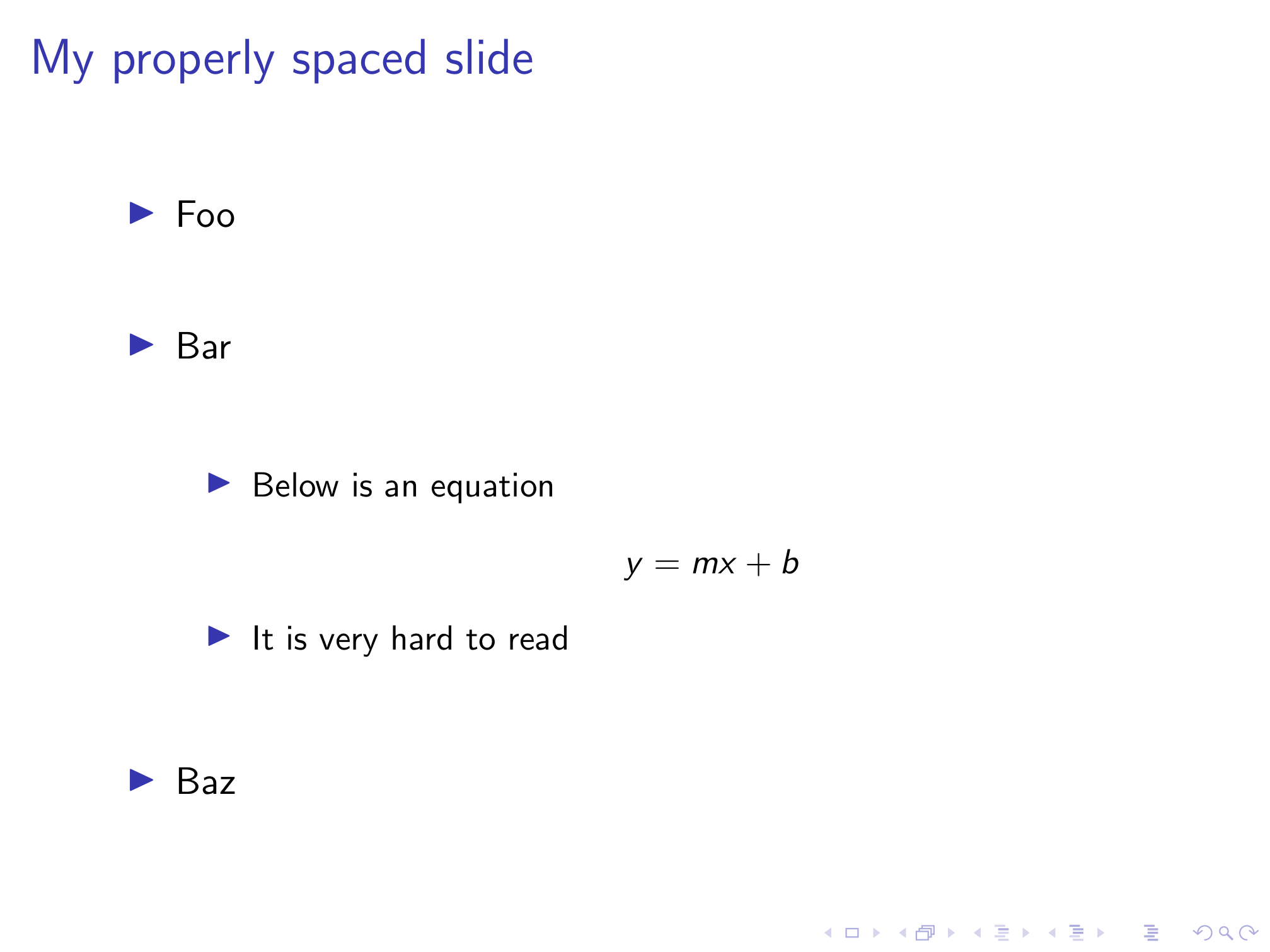 Now we’ve got a much more readable slide that will be automatically replicated for every other slide in our presentation. If you have multi-line equations in your slides, you can similarly redefine the align* environment to enlarge these equations as well.