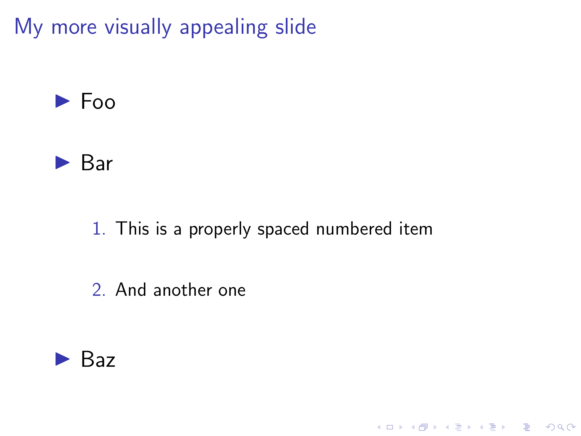 As we can see above, our redefinition of the \itemize environment also evenly spaces sub-bullets. However, it doesn’t do anything for numbered lists defined with /enumerate as the slide below shows.