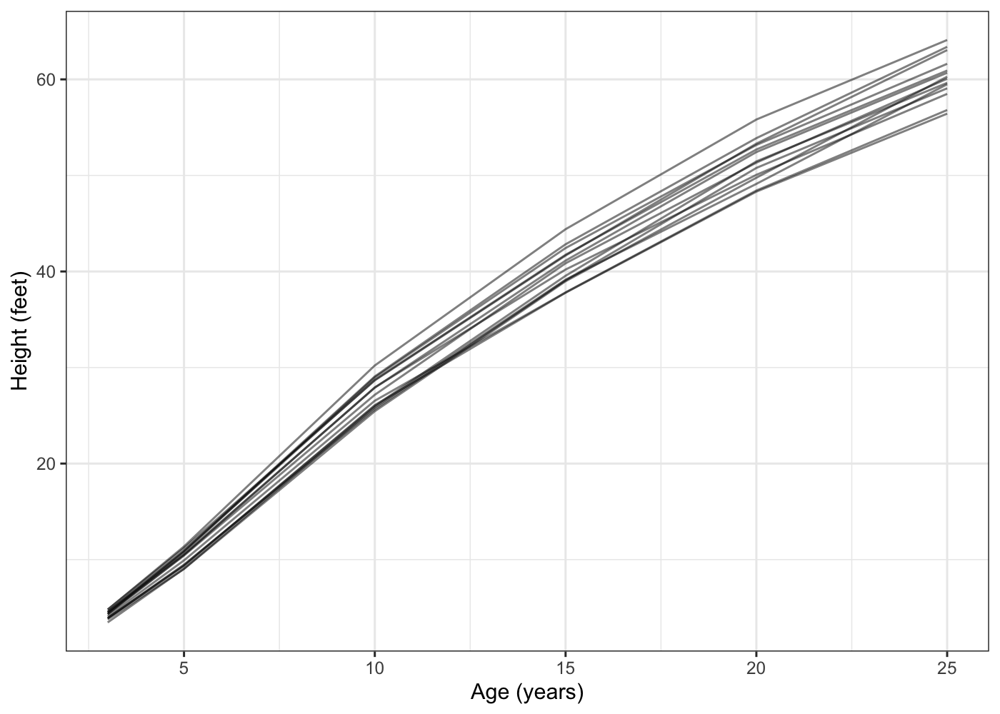 And now, to prove to you that this post really did start out as a .Rmd file, here’s some R code and a plot. Everyone’s seen mtcars a million times, and it turns out that iris was originally published in the Annals of Eugenics, so I went digging for a new built in dataset.4 I landed on the Loblolly pines dataset, which records the height of 14 different loblolly pine trees.5