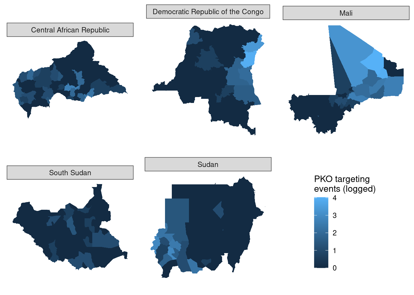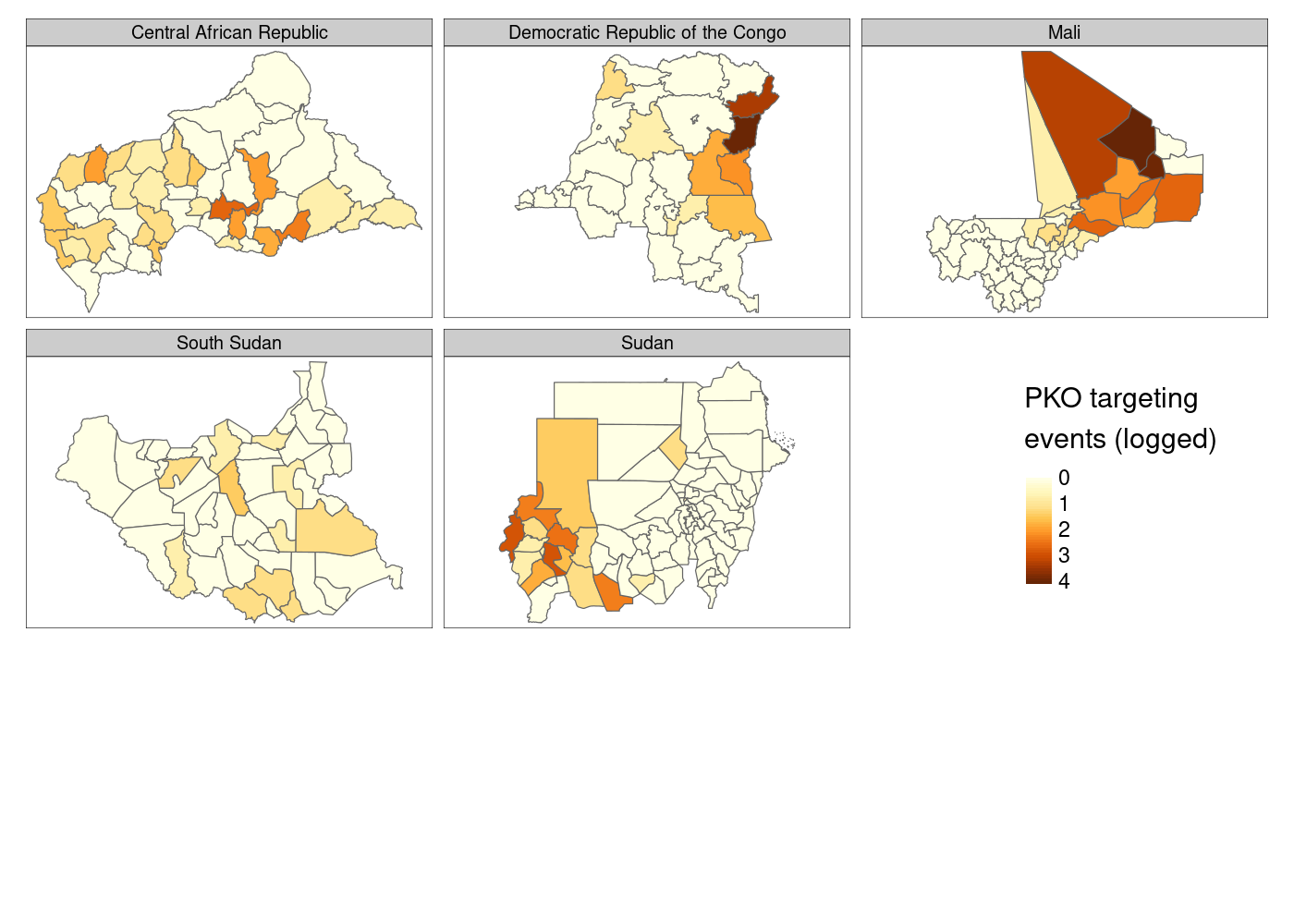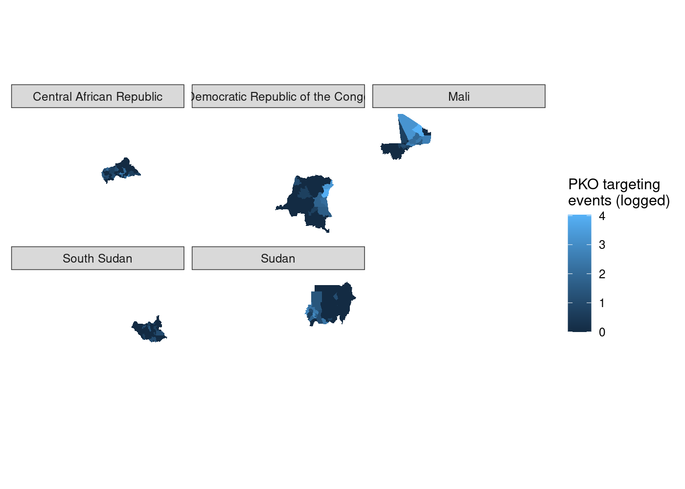 I’m working with cleaned and subsetted versions of ACLED and GADM, which I’ve uploaded to my website as PKO.Rdata if you want to download them and run this code yourself. The acled object contains a list of attacks on peacekeepers in active Chapter VII UN peacekeeping missions in Subsaharan Africa, while the adm object contains all of the second order administrative districts (ADM2) in the five countries with active missions.