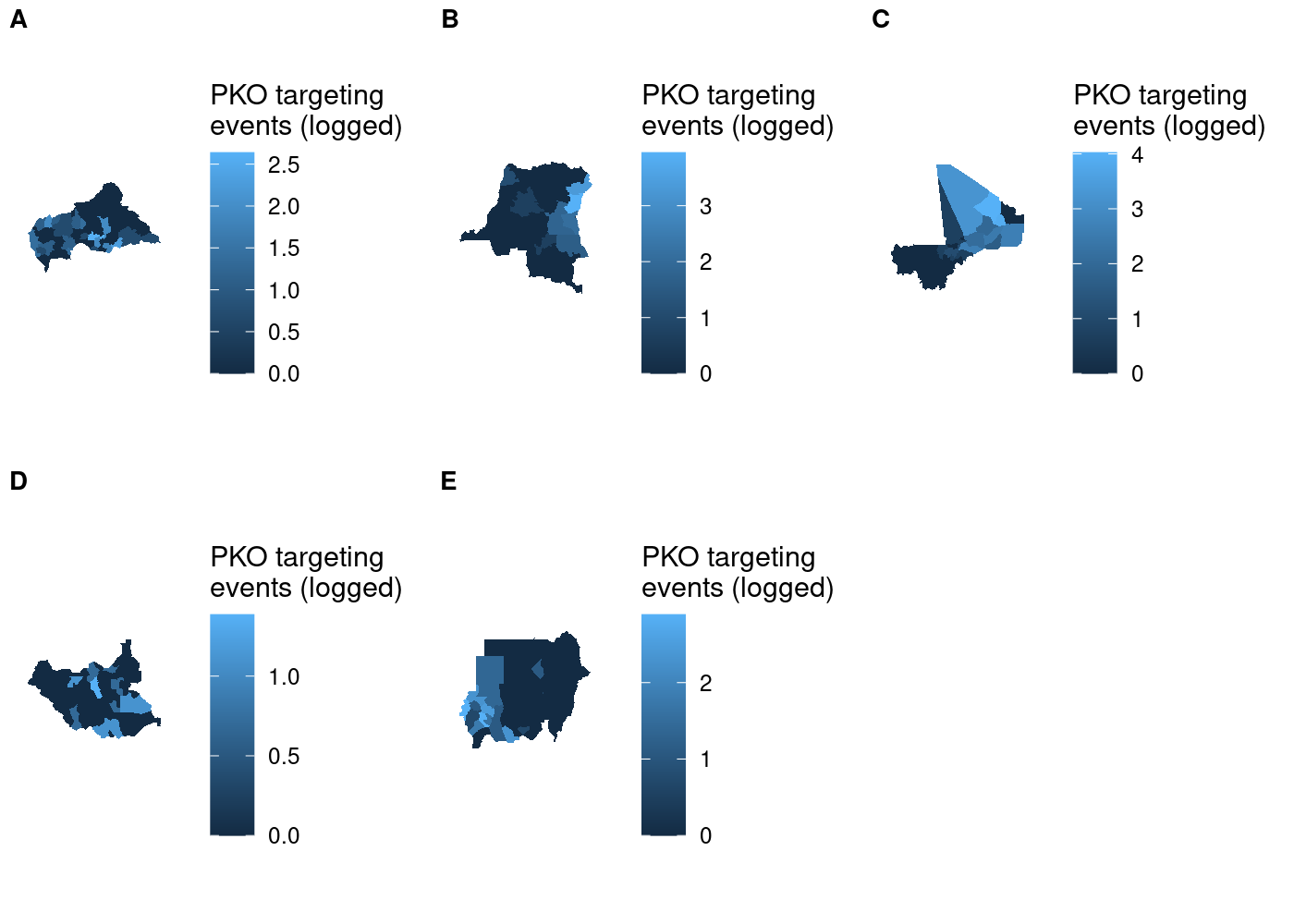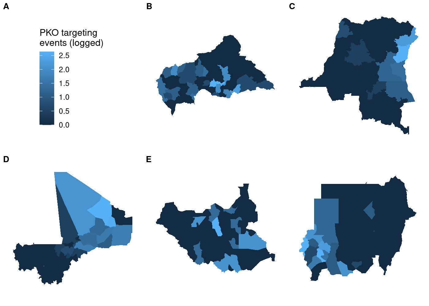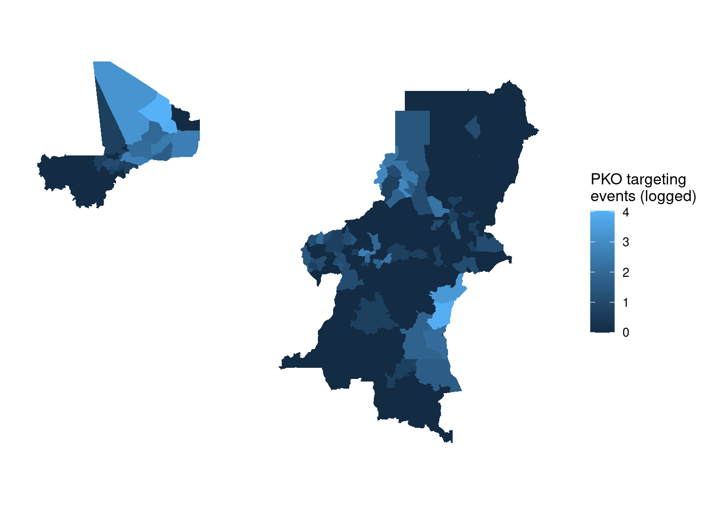 I’m working with cleaned and subsetted versions of ACLED and GADM, which I’ve uploaded to my website as PKO.Rdata if you want to download them and run this code yourself. The acled object contains a list of attacks on peacekeepers in active Chapter VII UN peacekeeping missions in Subsaharan Africa, while the adm object contains all of the second order administrative districts (ADM2) in the five countries with active missions.